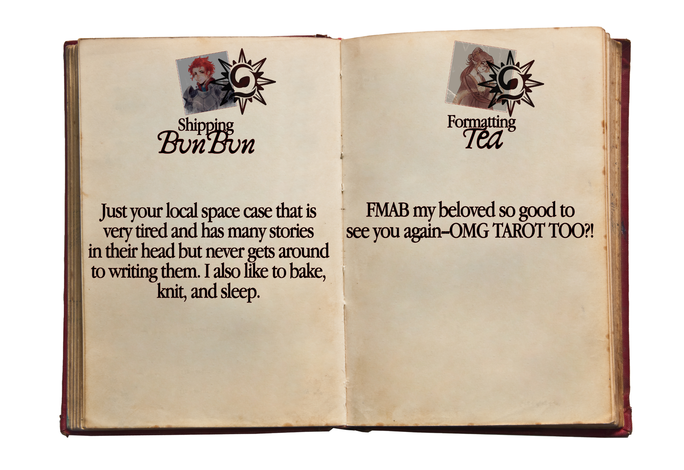 ☆ What is a zine? A zine is a compilation of derivative works, formatted in the style of a book or magazine.☆ Will the zine be physical or digital? Will the zine be for-profit or for charity? This project will, if sales permit, be a non-profit physical production. We will be donating to the Jordan Thomas Foundation, a charity that provides support to children and families affected by limb loss. Our ultimate goal is to create a full physical deck, a deck guide booklet, and merchandise!This project is SFW with a Mature rating at the highest to allow for canon typical violence at the mod team’s discretion.☆Do I need experience in zines to participate? Previous experience is not required, but professionalism and timeliness are a must in any and all collaborative projects.☆ Will I need a Discord account to participate? Discord is our key method of communication with participants. You will be expected to create a Discord account if you do not have one already.☆ What is the minimum age to apply and be a contributor? All applicants and contributors must be 18+ at the time of applying.☆ How will contributors be compensated? Contributors will, at the minimum, be compensated with a digital copy of our zine. If sales permit, contributors may receive a physical copy of our zine and/or merch at little to no cost.☆ What is your policy on AI or traced work? We do not tolerate any form of art theft; therefore, traced work and any AI generated writing/art are forbidden. Anyone found—in or out of the project—to be using any work that is not theirs, or using any AI generated programs, will be removed from this project immediately.☆ Will I be disqualified over my personal or outside fandom preferences? No, outside works will not have weight in your application or place in the project, but keep in mind that we are a SFW project and therefore so are the spaces we create, i.e. the project Discord. We've chosen to take a neutral stance on pro-ship, but such content will not be allowed in the zine; we are SFW PG-13 in our project, creative space, and communications.We do not, however, tolerate bigotry of any kind. Anyone who is to be found committing bigoted behavior and rhetoric will be removed from the project at any time during the project. We expect every applicant to understand this and to be on their best behavior.☆ Can my contribution be an older, previous piece? No—all contributors are required to create new pieces dedicated to the project’s theme.☆ Do I retain rights to my contribution? Yes, all contributors retain the rights to their pieces at all times; however, we ask that all contributions are withheld from public and commercial distribution until the mod team has given a release date, usually during leftovers or after the completion of the project.☆ I have more questions. Please contact us via email or send a DM on our social(s). Our Tumblr allows for anon.